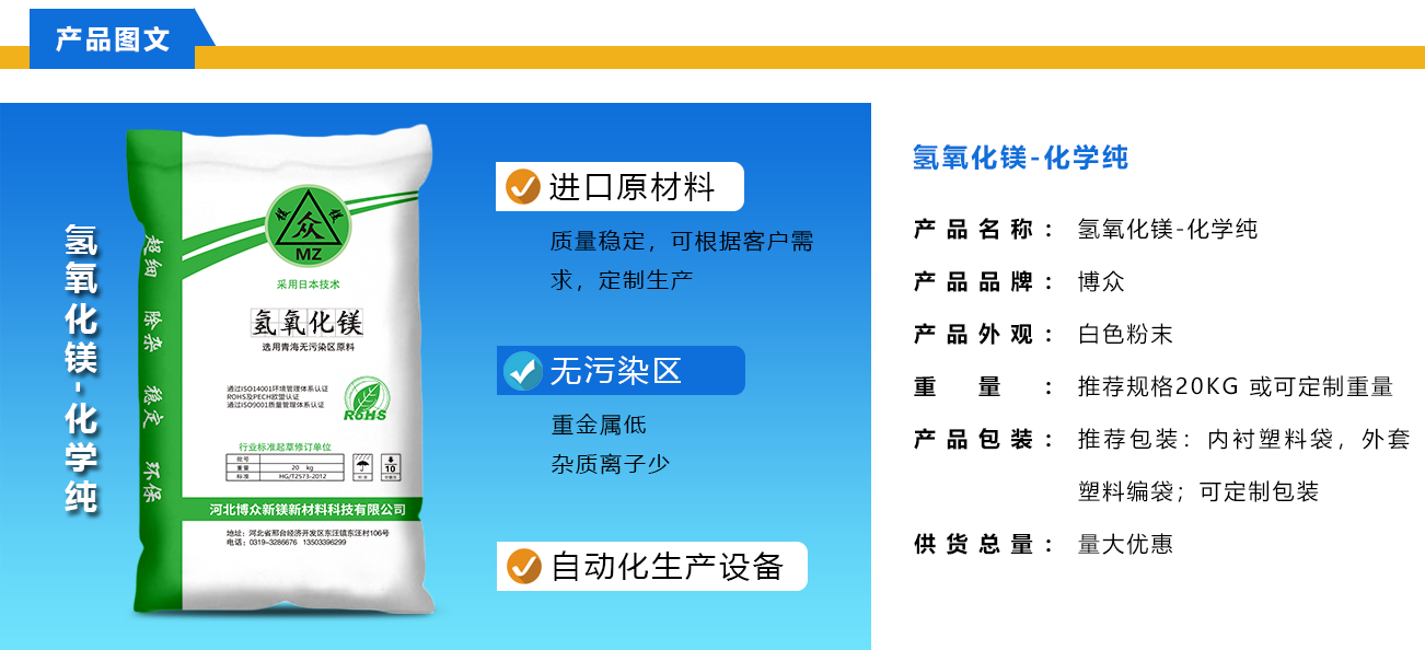 轻质氧化镁作为一种新型的无机盐镁质新材料,氧化镁具有比表面积较大、吸附性强、活性反应高等优点,近年来在环保相关领域领域,市场研发和应用研究越来越多,氧化镁可以处理环境中水处理、二氧化硫、工业有机废气,染料、农药、重金属离子等相关用途。 轻质氧化镁材料由于其比表面积较大,大于普通的氧化镁产品、而且产品的吸附性强、反应活性高等特点,在水、土壤、等环保治理领域应用前景广阔.轻质氧化镁市场价格较高,在很多领域应用大规模的应用较为受限等特点。